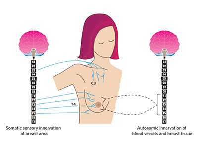 Black lines: autonomic (T1-T5); blue lines: sensory spinal nerves. Milk production requires coordination between these systems.